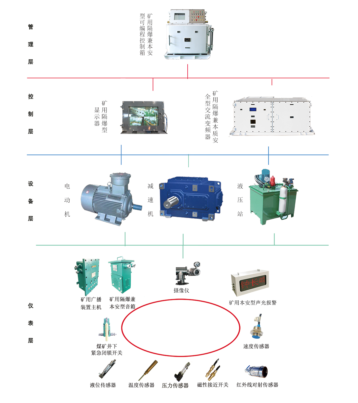 架空乘人裝置電氣控制系統(tǒng)(俗稱“猴車電控”)由礦用隔爆兼本質(zhì)安全型交流變頻器、礦用隔爆兼本安型可編程控制箱、礦用隔爆型顯示器、傳感器及攝像儀等組成。系統(tǒng)配備的人機界面可顯示架空乘人裝置的運行狀態(tài)、安全保護、故障編碼、故障位置及歷史記錄,系統(tǒng)具有可擴展、自診斷、語言告警等功能。